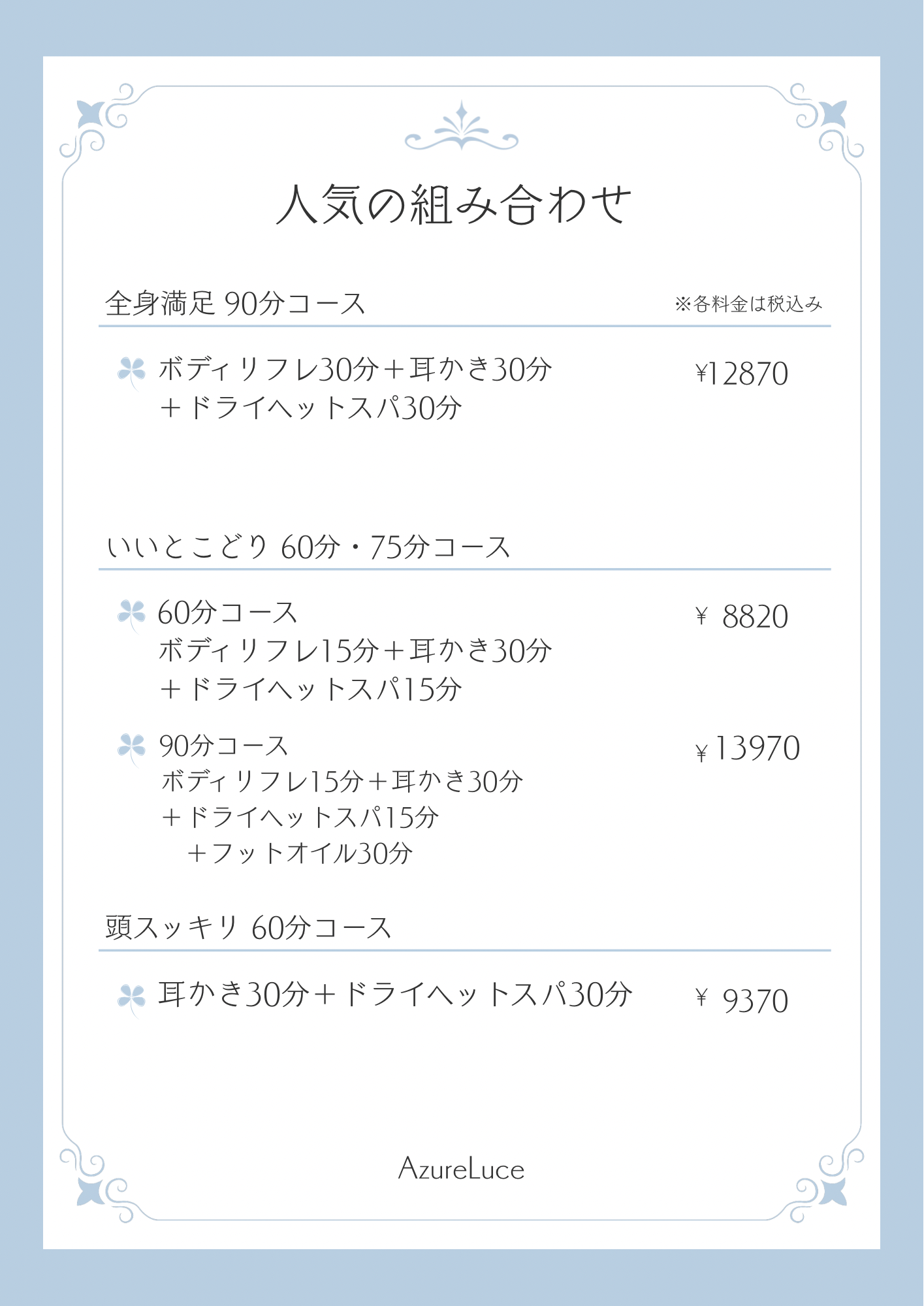 ボディリフレコース内の一部を耳かき・ドライヘッドスパに変更可能です。(お得!!)